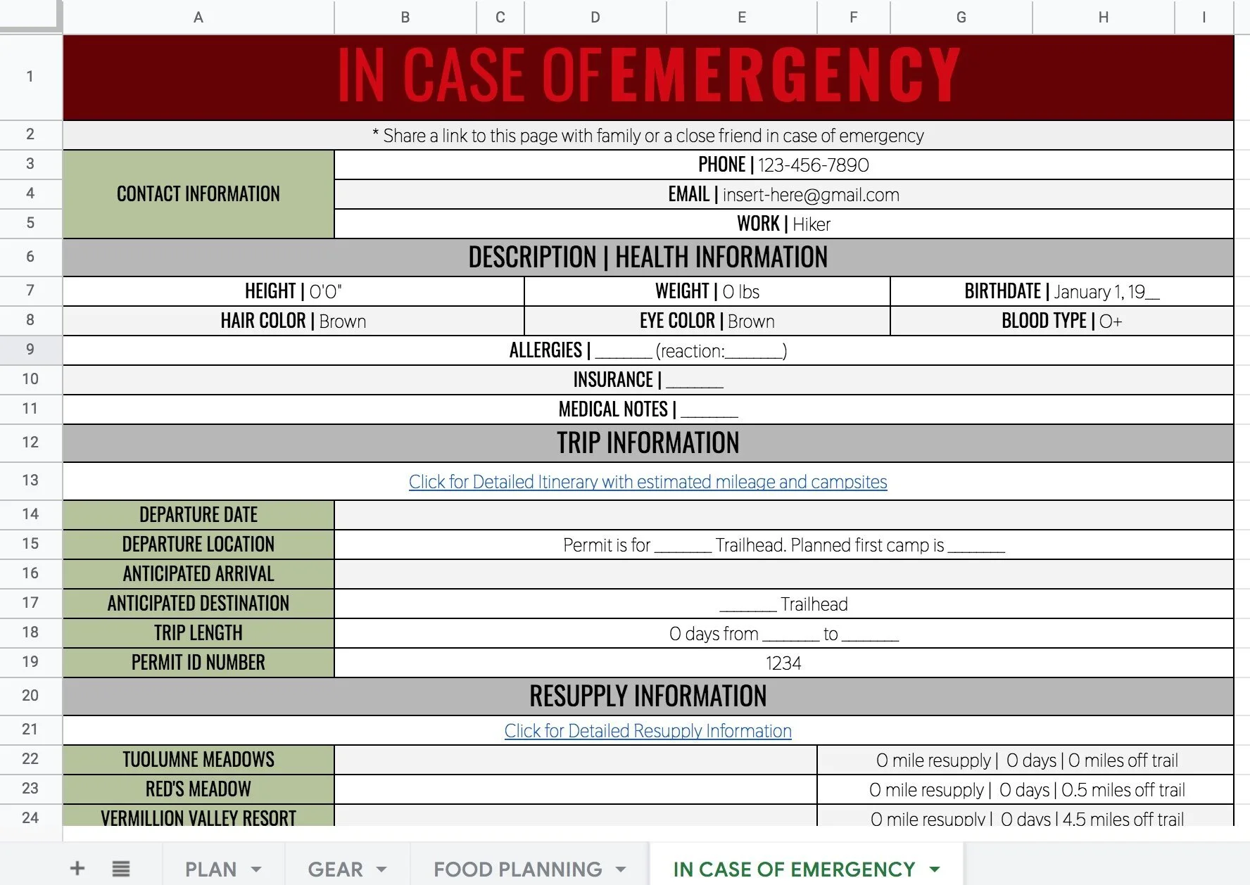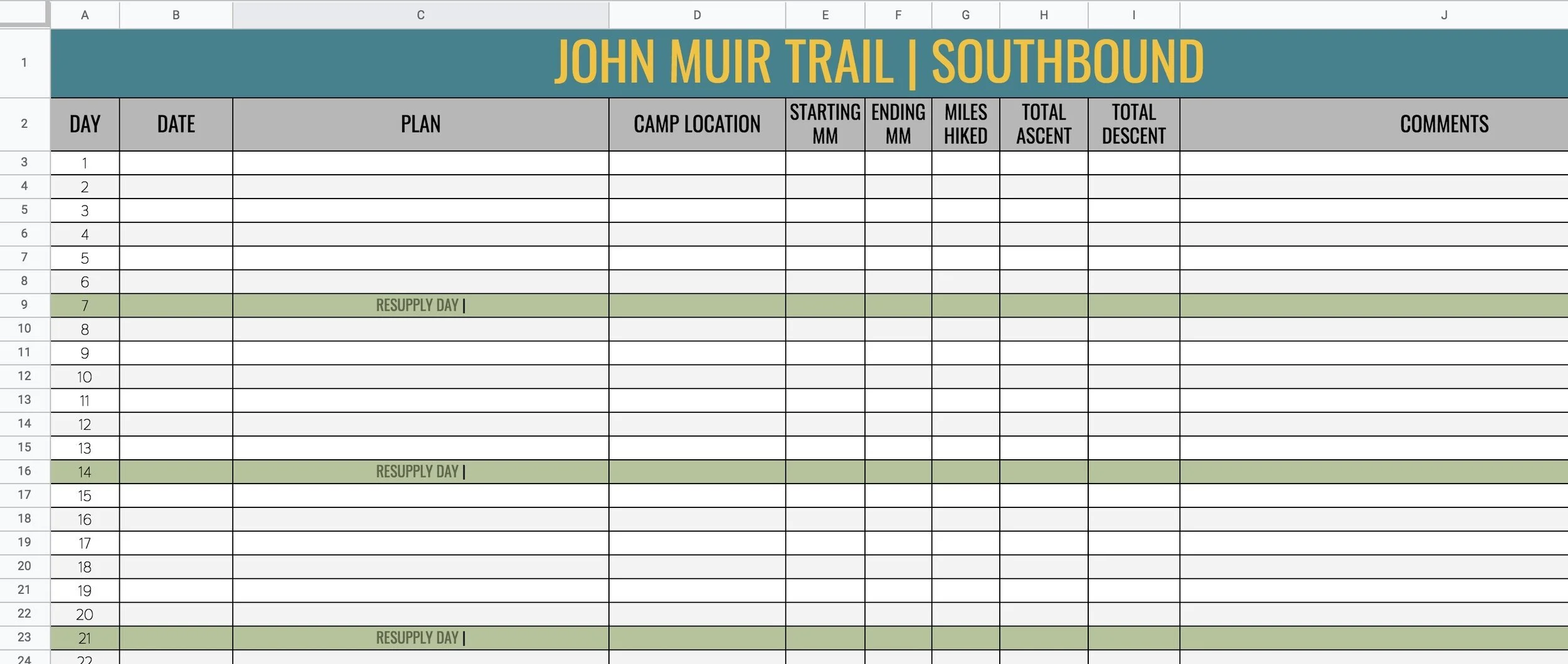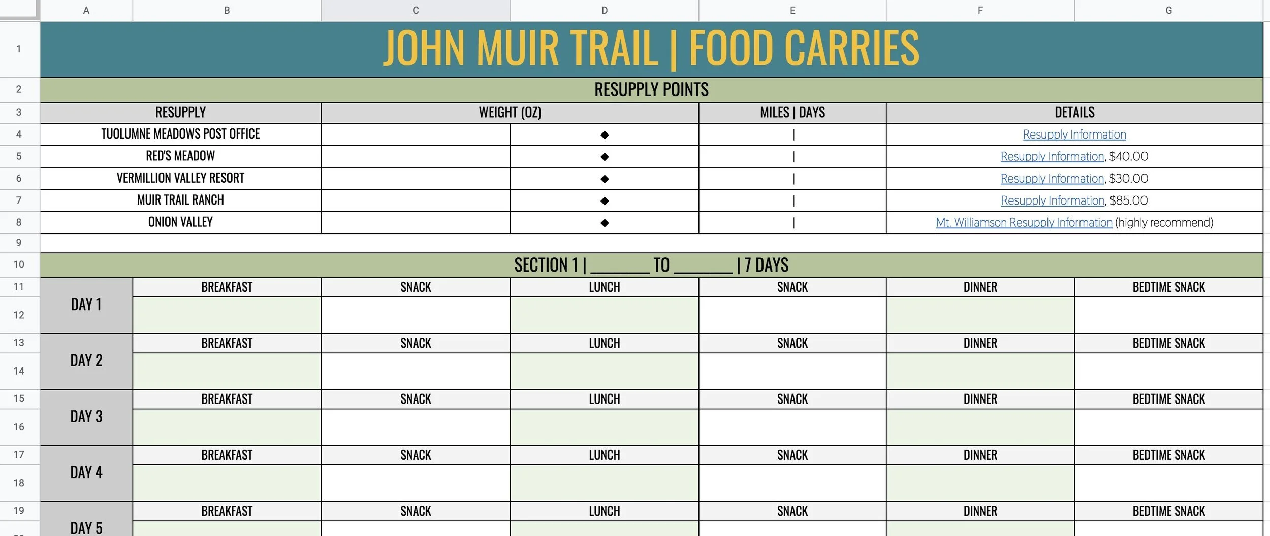To make things simple for the design, each tab has four sections of seven days each. In your copy of the planning guide, you can edit these sections to fit your resupply schedule. Please let me know if you have any issues making your own document or have something you would like me to add.