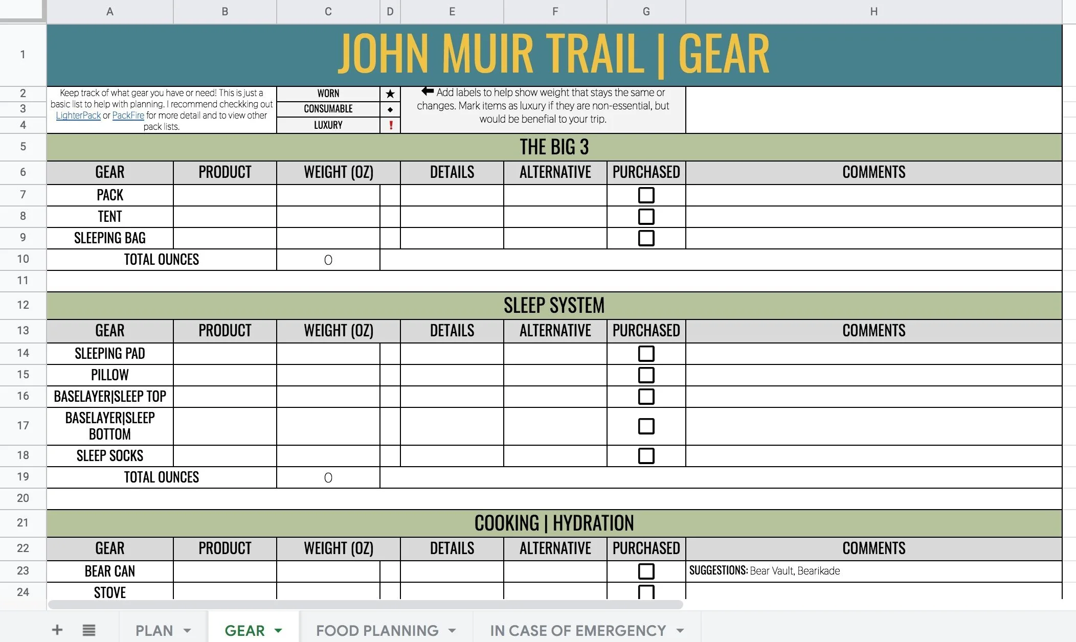 I made a version of this prior to my (planned) thru hike in 2019 and again in 2020 on my SOBO hike from Lyell Canyon to Whitney Portal. This version is for YOU! Feel free to make a copy or download it for personal use, but please do not edit the original document.